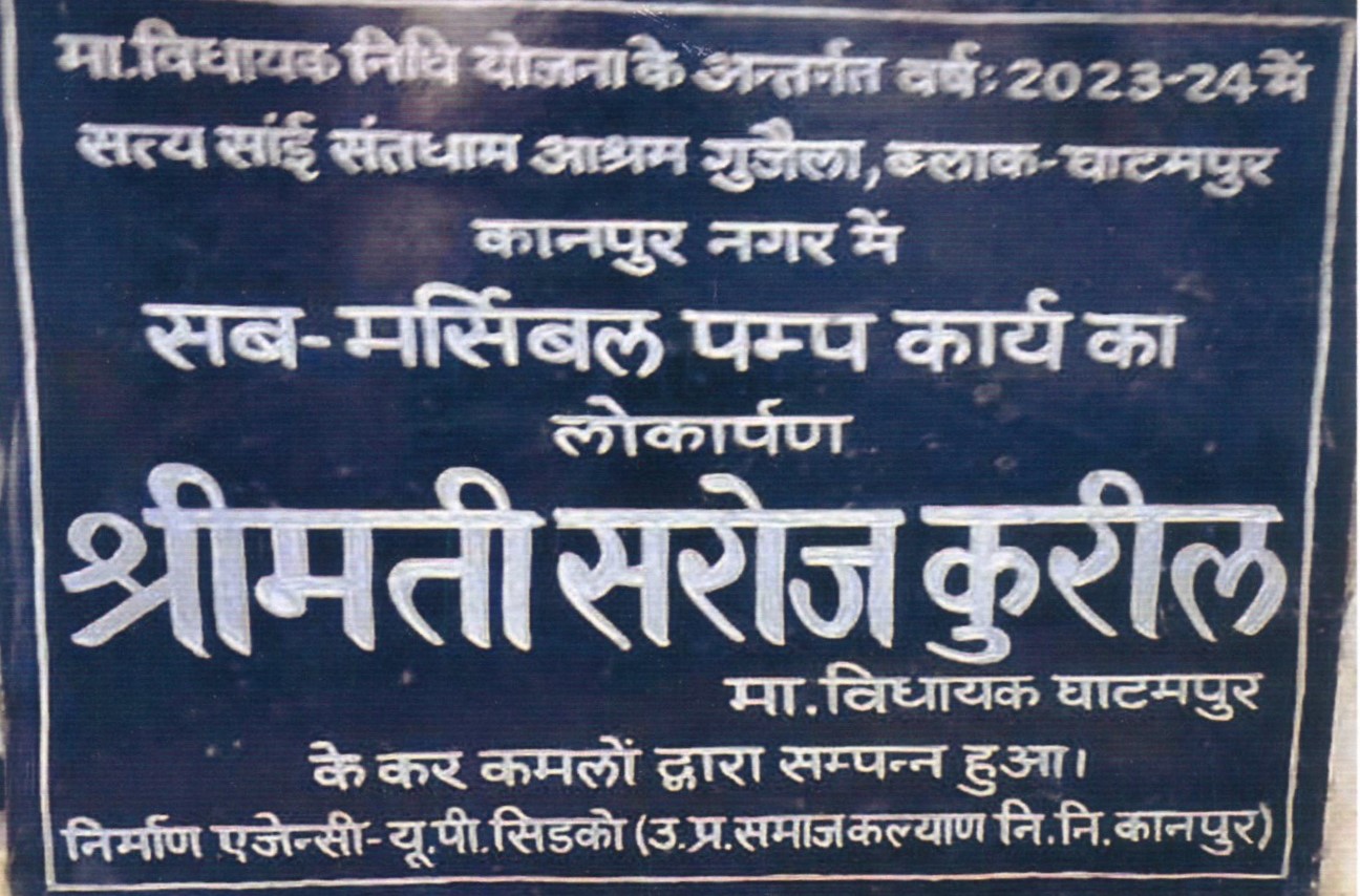 | कार्य का नाम – विधानसभा घाटमपुर के अन्तर्गत सत्य सांई सतधाम आश्रम गुजैला ब्लाक घाटमपुर कानपुर में एक नग सबमर्सिबल पम्प का अधिष्ठापन का कार्य़। कार्य की लागत – 1.94 लाख