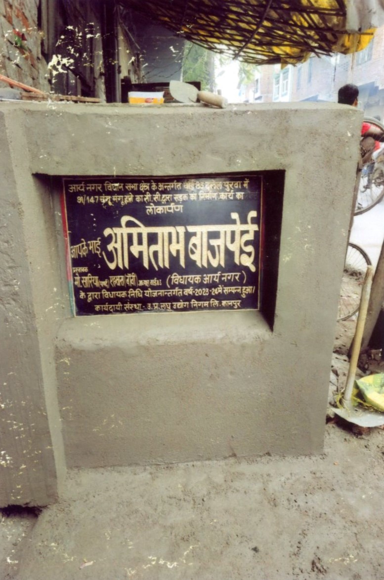 | कार्य का नाम – आर्यनगर विधानसभा के अन्तर्गत वार्ड- 83 दलेल पुरवा में 91/47 छंगू मंगू के हाते में अकील के घर से सलील के घर से होते हुये इशाद भाई के घर तक सी0सी0 रोड का निर्माण कार्य। लम्बाई 86मी0 लम्बाई 86 मी0 ।
