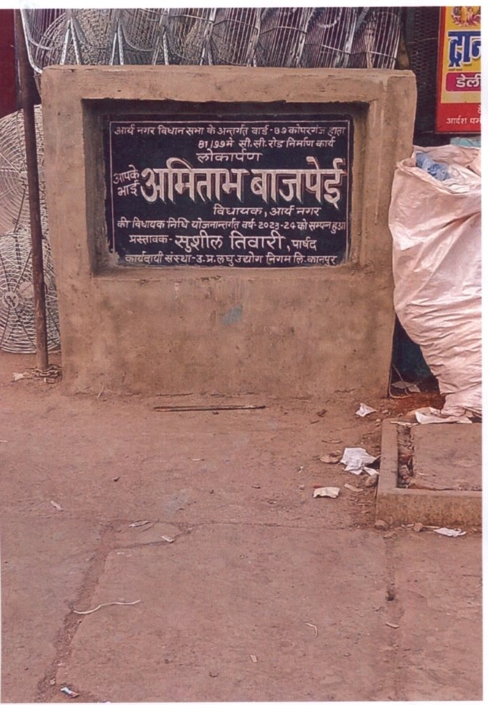 कार्य का नाम – आर्यनगर विधानसभा के अन्तर्गत वार्ड- 89 कोपरगंज हाता 81/99 से सत्यम मिश्रा तक सी0सी0 रोड का निर्माण कार्य। लम्बाई 45मी0