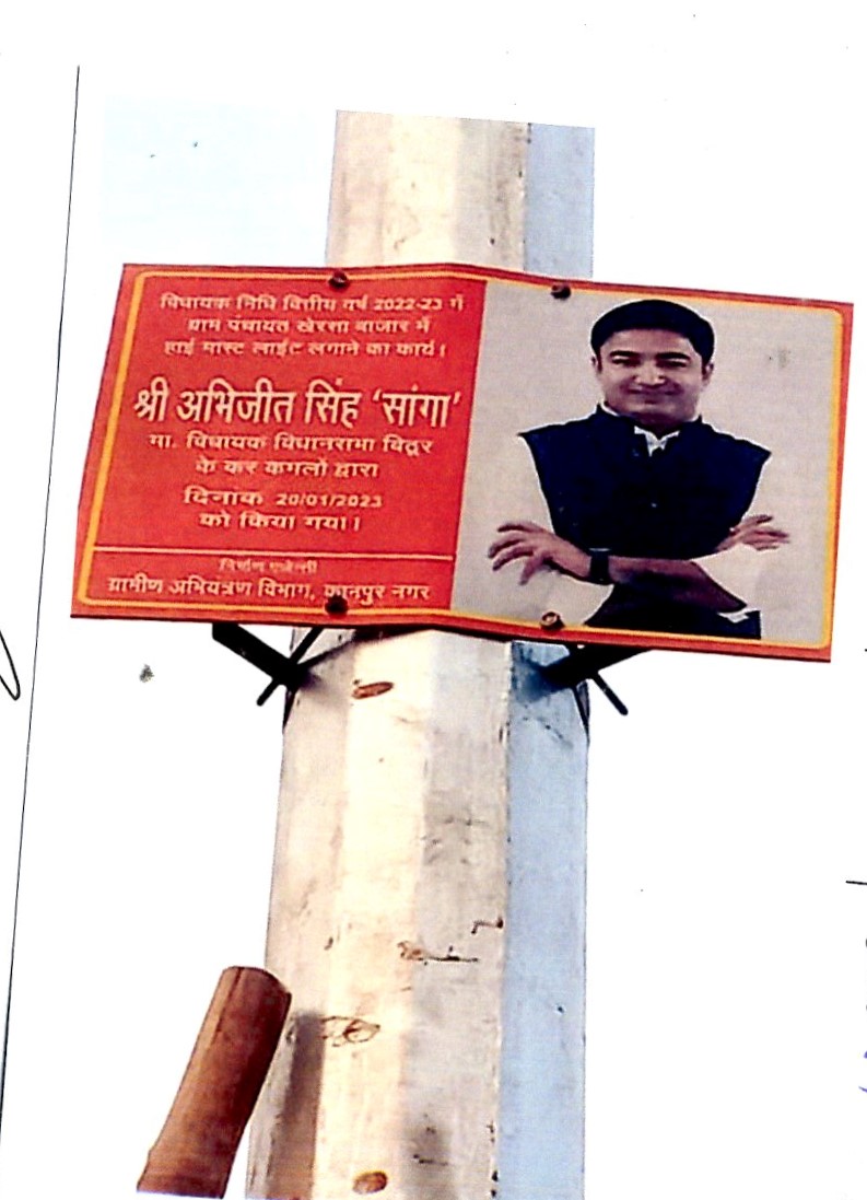कार्य का नाम – विकास खण्ड विधनू के अन्तर्गत ग्राम पंचायत खेरसा के खेरसा बाजार में 01 नग लाइट का अधिष्ठापन।