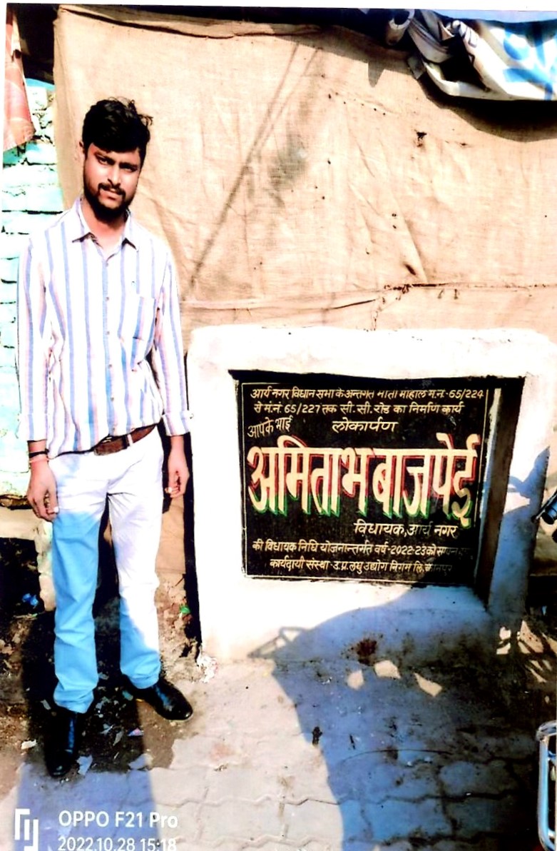 कार्य का नाम – आर्यनगर विधानसभा के अन्तर्गत मोती मोहाल में म0नं0 65/224 से मकान नं0 65/227 तक सी0सी0 रोड का निर्माण कार्य। लम्बाई 29मी0