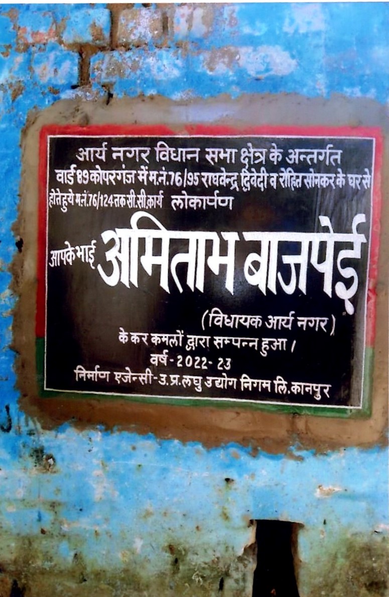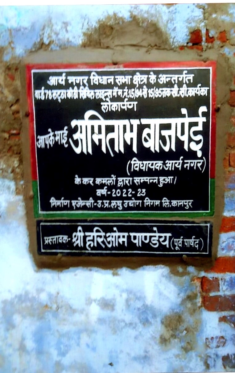 कार्य का नाम – विधानसभा आर्यनगर के अन्तर्गत वार्ड-89 कोपरगंज में मकान नं0 76/95 राघवेन्द्र द्विवेदी, रोहित सोनकर के मकान से होते हुये मकान नं0 76/124 तक सी0सी0 रोड का निर्माण कार्य। लम्बाई 100मी0
